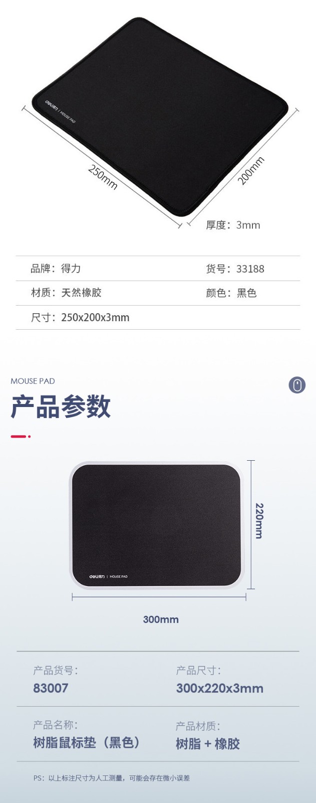 得力3692 鼠标 鼠标垫 耐磨防滑橡胶材质鼠标垫 办公防滑垫 游戏鼠标垫 键盘桌垫 办公用品 200mm*250mm 黑色耐磨 3692